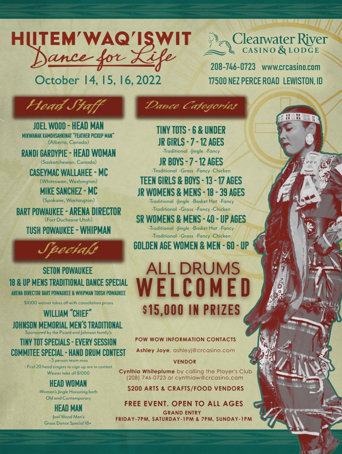 « All Events This event has passed. HIITEM’WAQ’ISWIT (Dance for Life) Powwow October 14, 2022 - October 16, 2022 « Heart of the Monster, Nimiipuu Creation Story, with Julian Ankney, WSU Vancouver Coordinator of Native Programs Indigenous Ways of Learning » Add to calendar Google Calendar iCalendar Outlook 365 Outlook Live Details Start: October 14, 2022 End: October 16, 2022 Venue Clearwater River Casino & Lodge 17500 NEZ PERCE ROAD LEWISTON, ID United States + Google Map Phone: 208-746-0723 View Venue Website