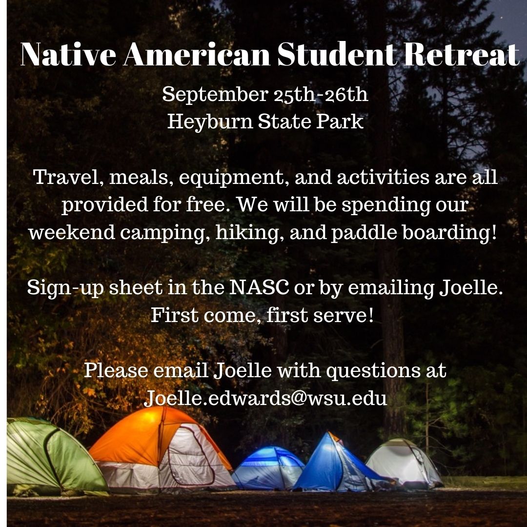 « All Events This event has passed. Native American Student Retreat September 25, 2021 - September 26, 2021 « Native American Programs Welcome Back BBQ Orange Shirt Day » Add to calendar Google Calendar iCalendar Outlook 365 Outlook Live Details Start: September 25, 2021 End: September 26, 2021 Organizer Joelle Berg Phone: 509.335.8677 Email: joelle.edwards@wsu.edu