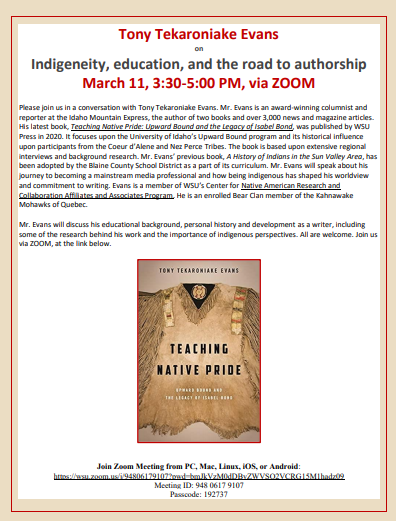 « All Events This event has passed. Tony Tekaroniake Evans on “Indigeneity, education, and the road to authorship” March 11, 2021 @ 3:30 am - 5:00 pm « Nimiipuu Perspectives Speakers Series: Meeting One Nimiipuu Perspectives Speaker Series II: Language, Song, and Place » Add to calendar Google Calendar iCalendar Outlook 365 Outlook Live Details Date: March 11, 2021 Time: 3:30 am - 5:00 pm Organizer Office of Native American Programs & Tribal Relations